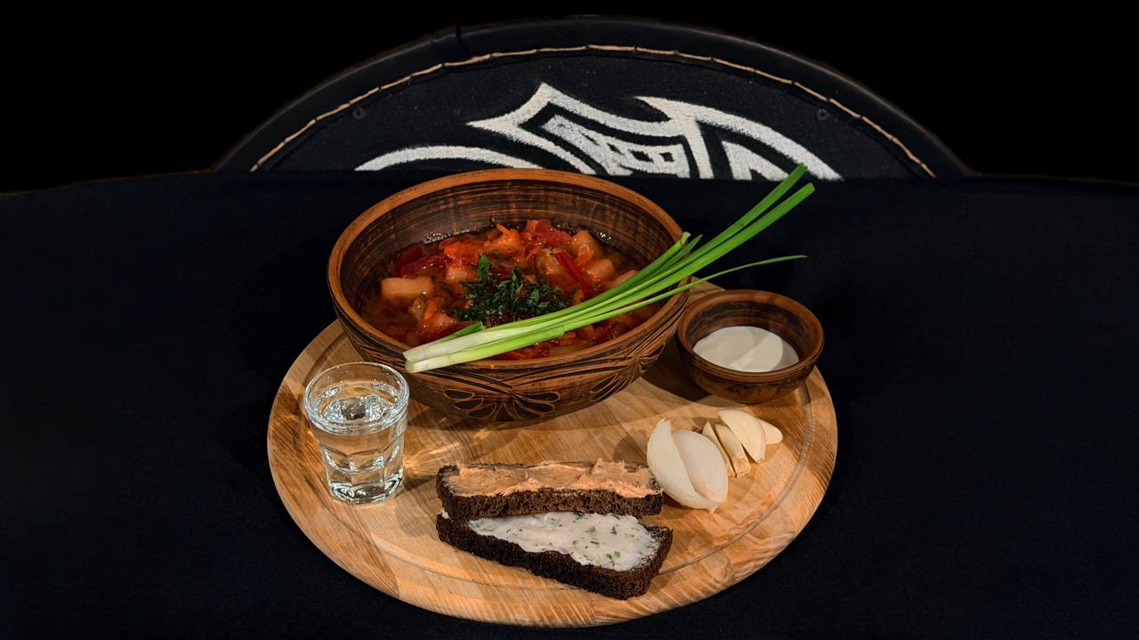 Картопля запечена, морква запечена, буряк запечений, капуста квашена, цибуля ріпчаста, бульйон курячий, ребро свиняче запечене, сіль, овочева приправа, сметана, часник, цибуля зелена, хліб бородинський. (в цій страві є алергени)