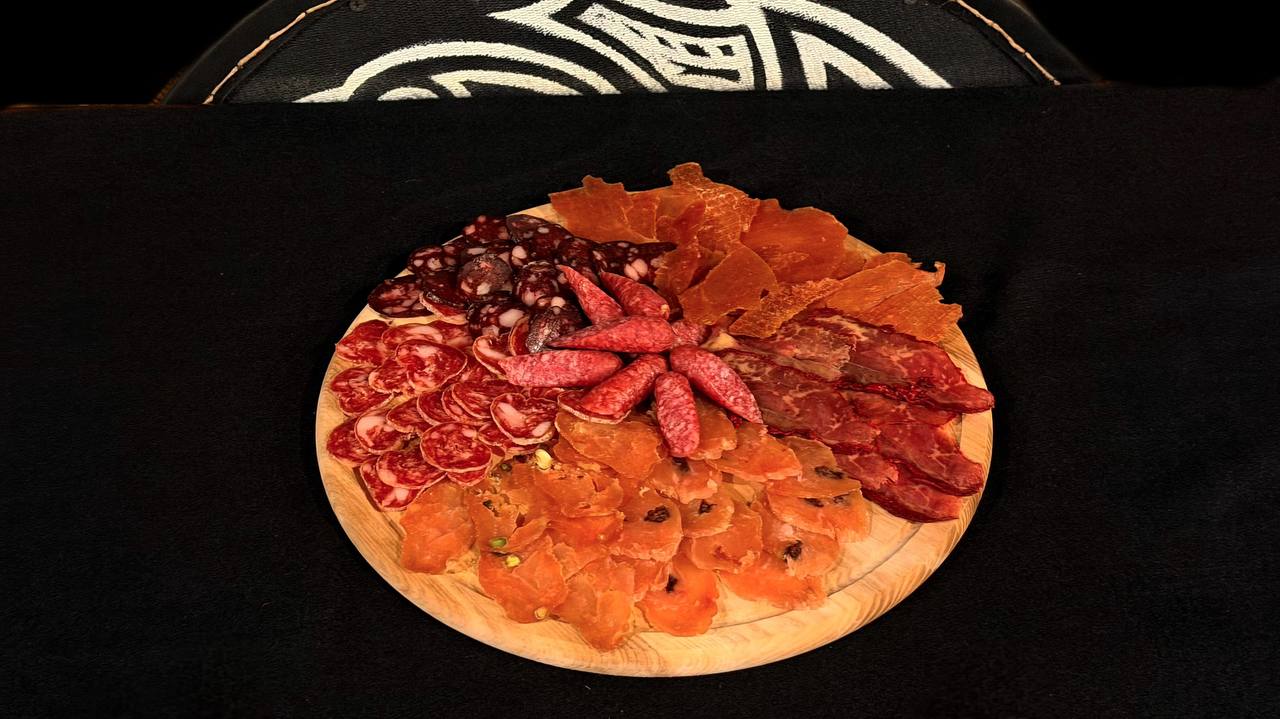 Шовдар варений, шовдар копчений, бастурма, в´ялена оленина, салямі гостра, хрін, гірчиця, мікрогрін огірок, пудра моркви. (в цій страві є алергени.)