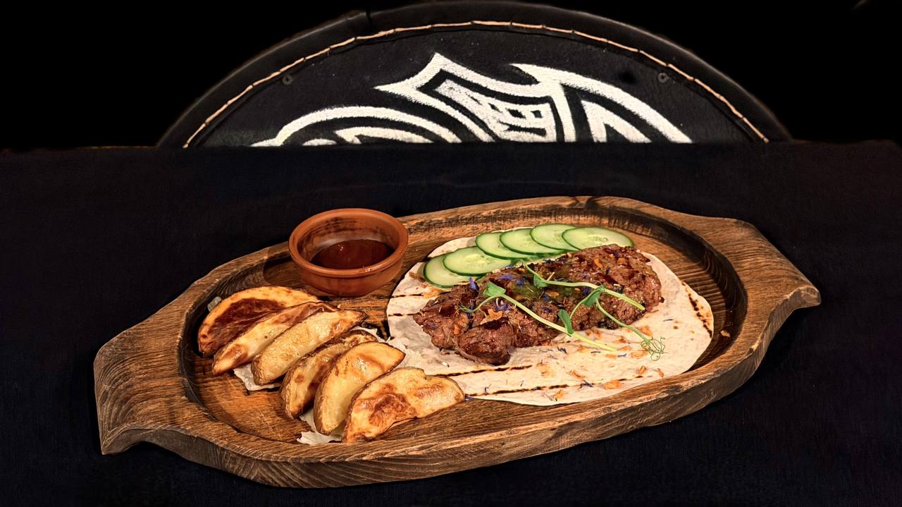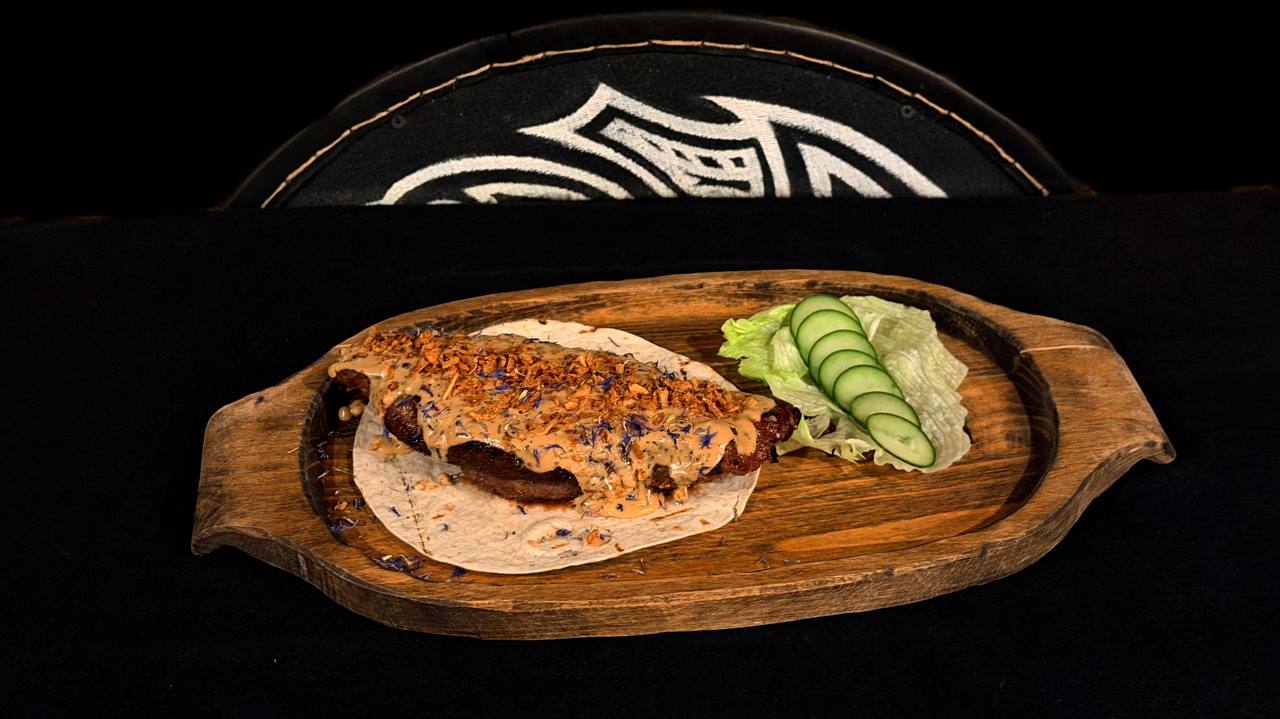 Стейк рібай з додаванням приправ для грилю, які використовували вікінги, олія пряна, масло вершкове зелене. Подається на тортильї з огірком, салатом айсберг, картоплею запеченою, мікрогріном, квітами волошки та соусом BBQ. (в цій страві є алергени)