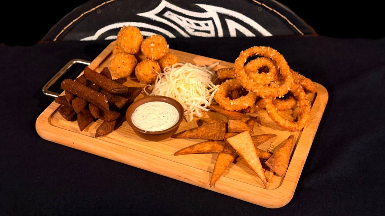 Кільця цибулеві, грінки хлібні, чіпси з лаваша, сир чечил, кульки сирні, соус фірмовий.(в цій страві є алергени)