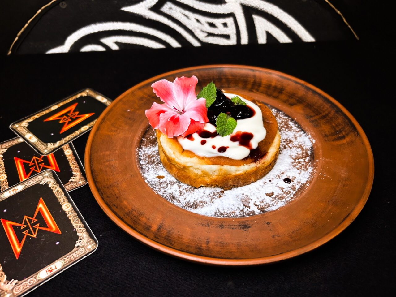 Крем сир, вершки, вишневе кюлі, крем наполеон, мята, квіти їстівні, цукрова пудра. (в цій страві є алергени)