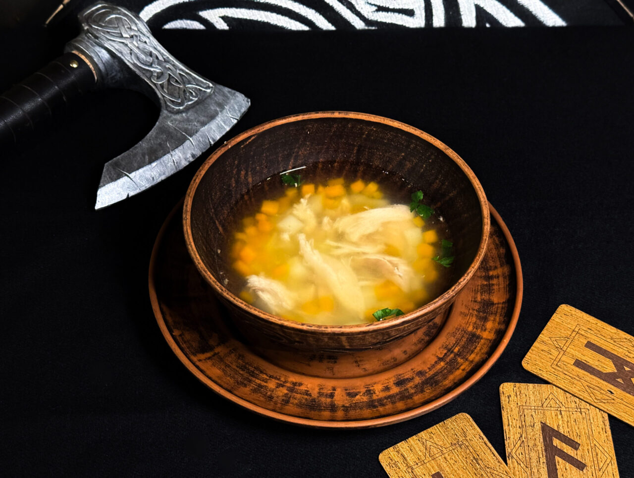 М’ясо курки, запечена морква та картопля, макарони павутинка, петрушка. (в цій страві є алергени)
