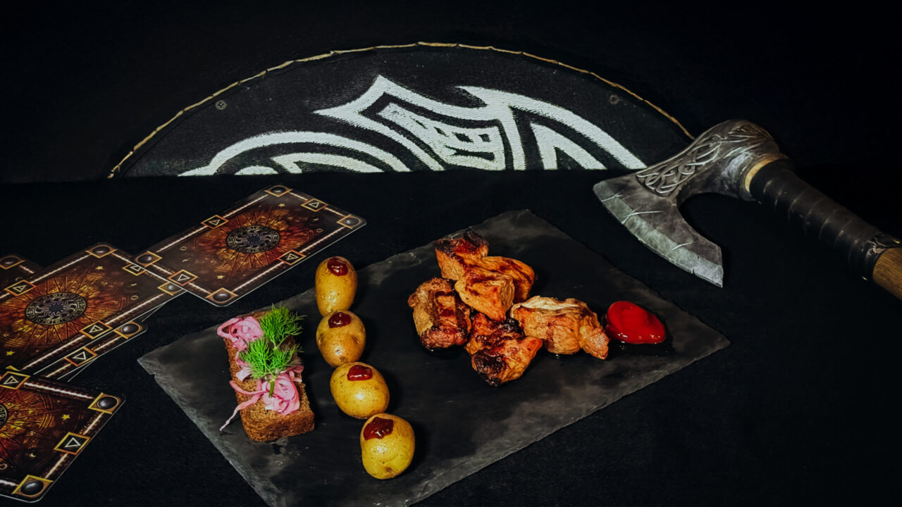 Маринований свинячий ошийок, обсмажений до карамельної скоринки. Подається з молодою картоплею з маринованою червоною цибулею, кропом та соусами: BBQ, кетчуп. (в цій страві є алергени).