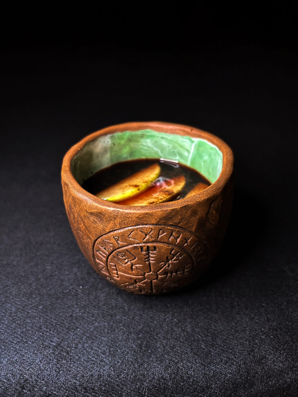 Алкогольний гарячий напій традиційний напій Скандинавії, що зігріває душу. З давніх-давен вважалось, що цей нектар – справжнє джерело затишку та розкоші. Створений богами на основі червоного вина та коньяку, має солодкий відтінок завдяки меду. Родзинки та смажені мигдальні горішки додають йому відчутної текстури, суміш різнотравʼя та спецій дарує довершений смак, а паличка кориці надає аромату теплоти.
