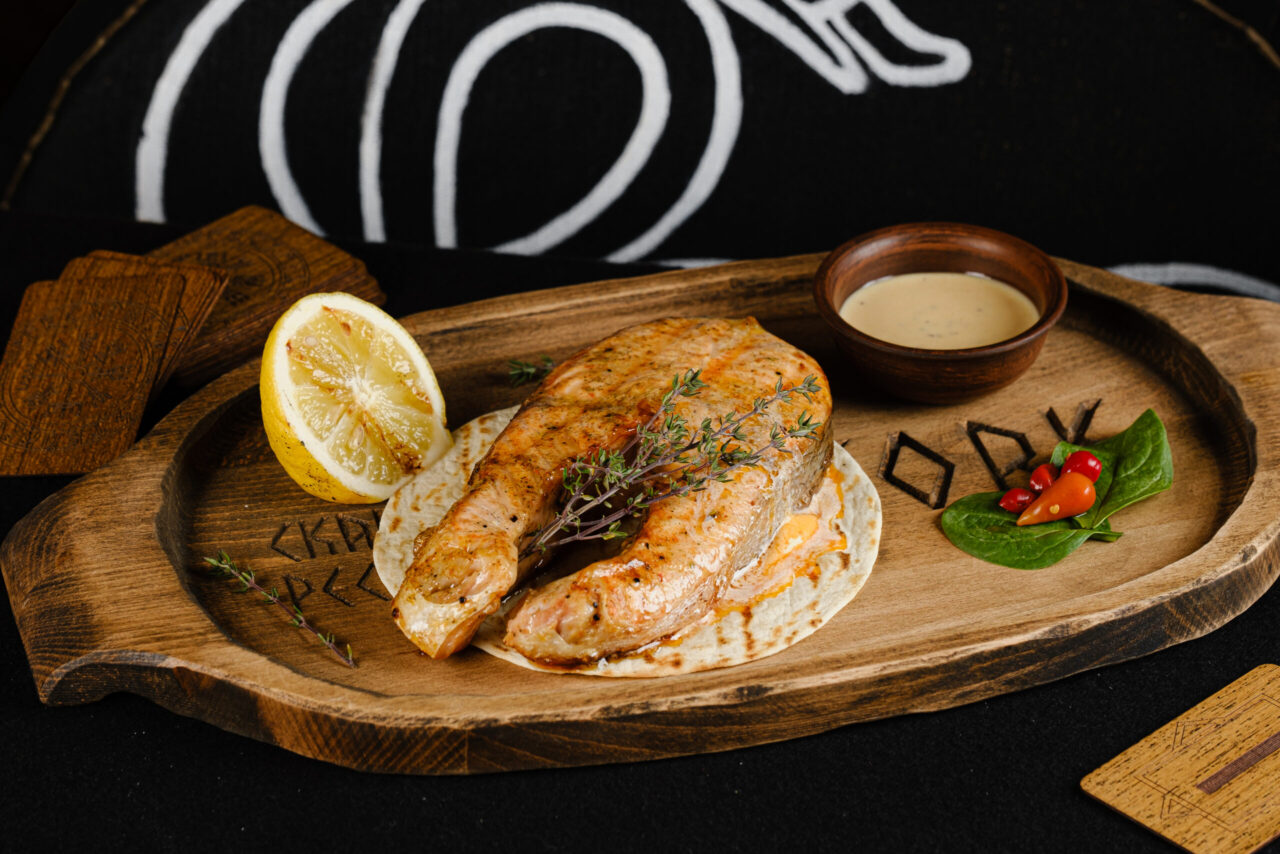 Лосось, олія пряна, скандинавські спеції для грилю, лимон, вершкове масло червоне, соус коктельний, свіжий чебрець, перець пірі пірі маринований, шпинат бебі та тортілья (в цій страві є алергени)
