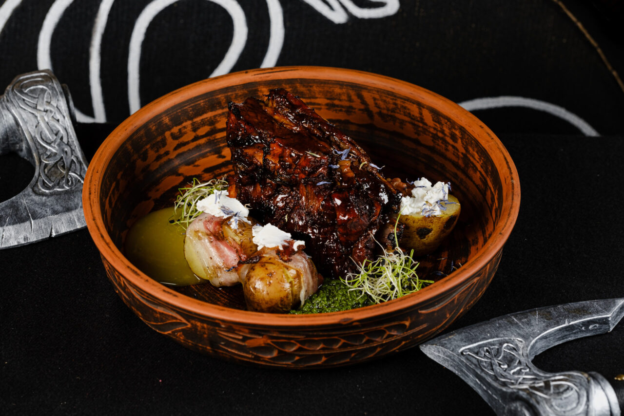 Свинні ребра, козиний сир шевред, картопля запечена, бекон панчетта, соус схуг, соус медово-гірчичний, соус BBQ, квіти волошка, мікрогрін. (в цій страві є алергени)