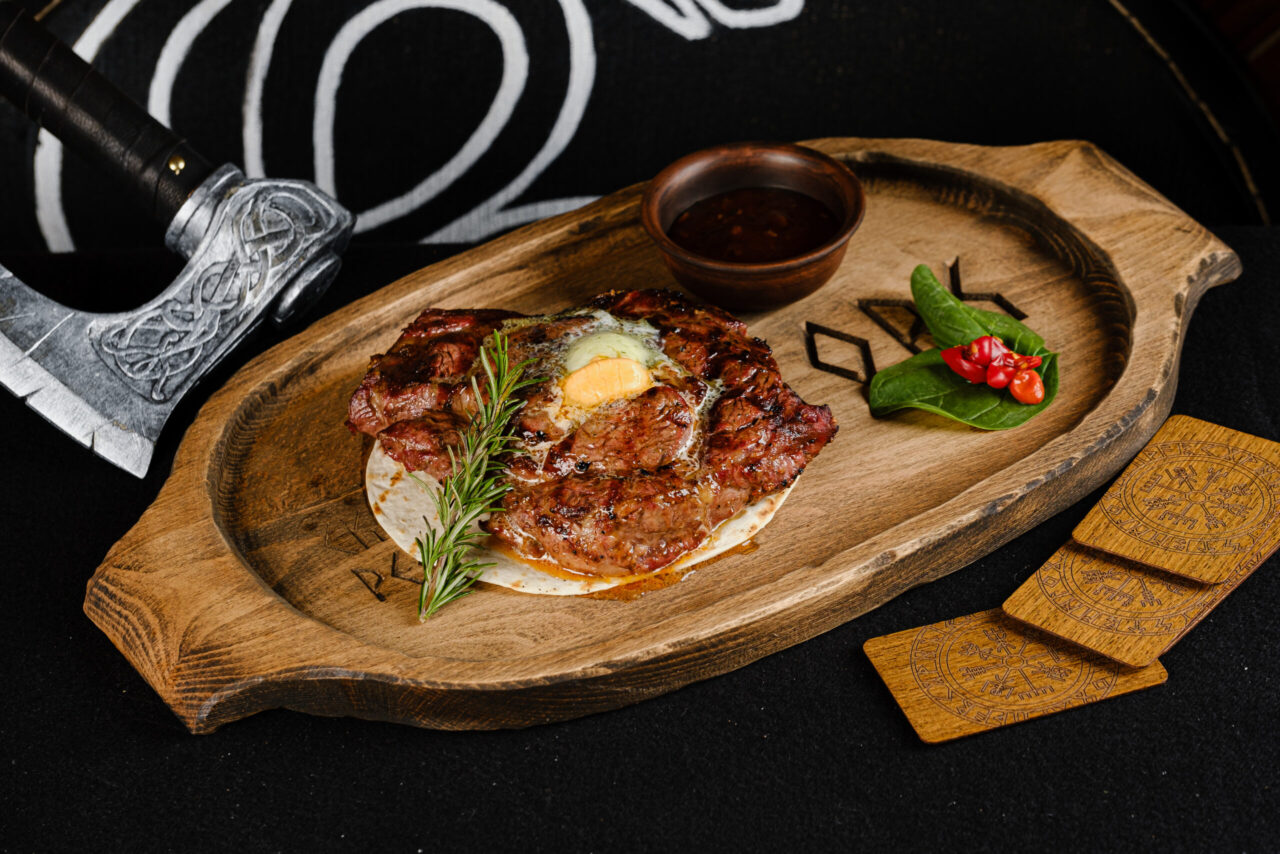Стейк рібай з додаванням приправ для грилю які використовували вікінги, олія пряна, перець пірі пірі маринований, розмарин, масло вершкове червоне та зелене. Подається на тортильї та соус BBQ. (в цій страві є алергени)